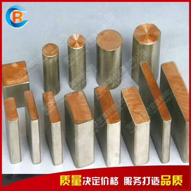 由于钛合金板与夹层铜板贴合紧密,制造过程中钛合金板变形量极小,有效保证了钛合金板不会因变形量过大而破损,工艺过程简单高效,达到节约钛材、提高生产效率及降低生产成本的目的。执行标准:GB/T12769—2003覆层材料:钛Ti、镍Ni、锆Zr、不锈钢(316L)等基层材料:紫铜(T2)、无氧铜(TU2)、铝(AL)等端面形状及规格(mm)圆形:φ(2~80)×(0.5~3.0)鼓形:φ(25、27、29、32、34)×14×(1.0~2.0)方形:边长(10~40)5扁形:长(10~100)×宽(10~30)圆角过渡R(3~5)可根据用户要求生产不同规格的圆形、鼓形、方形、扁形等复合棒,还可进行不同形状的弯曲及组焊。并可根据用户要求试制其它规格产品钛铜复合棒的检验采用超声波探伤检测。